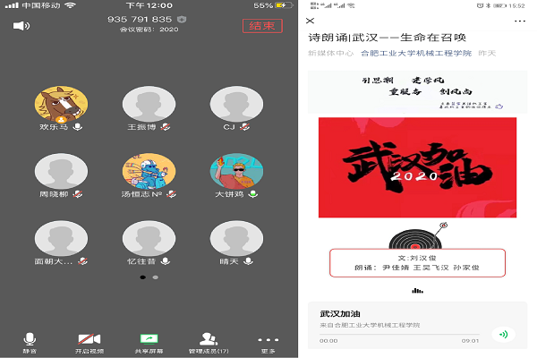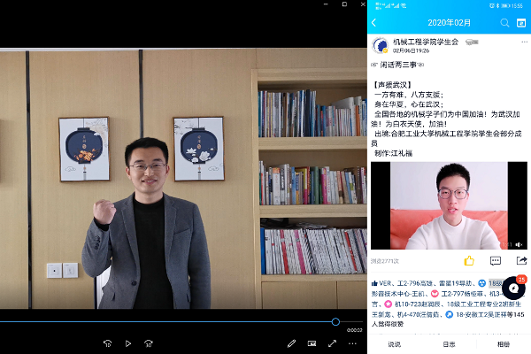 19级辅导员田崇浩、丁玲以腾讯会议线上平台为载体,开展了“坚定信心,做好防疫”的主题教育,并为学生新学期线上上课等问题进行了集中答疑辅导;18辅导员吴其林和学生会骨干一起专门录制短视频鼓励同学们:“面对疫情,我想对你说:放松心情,增强信心,相信国家的硬核实力;响应号召,居家守候,就是最好的攻坚克难;如有需要,随时呼叫,学校和我们就是你的坚强后盾!加油!”18辅导员尹佳婧和学生隔空合作线上录制了一段诗朗诵《武汉——生命在召唤》,鼓励湖北籍、武汉籍的同学要坚信我们一定能打赢这场战“疫”,同学们并不孤单,全国人民一直和你们战斗在一起;17级辅导员张帆和刘洋利用雨课堂、学习强国等载体保证学生党支部组织生活会和党员教育学习不断线,通过布置预习任务、设置学习问答等环节,鼓励同学们以自身实际行动为疫情防控贡献自己的力量;16级辅导员周晓柳和马超通过视频会议讨论部署疫情防控阶段的毕业生考研复试和就业服务,利用线上调研掌握学生复试和就业需求,进行一对一简历辅导,组织视频模拟面试活动,为空中就业“热身”,并同企业共建空中就业对接群,通过在线文档将信息集中和共享,助力毕业生就业服务;研究生辅导员侯静指导12个研究生党支部线上带领大家学习疫情防控知识、“防疫”倡议书等,倡议全院同学坚定信心、同心同向、众志成城,坚决打赢这场疫情防控阻击战!