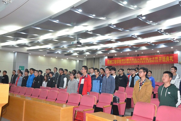 仪式开始,全体成员起立并奏唱国歌。研习社班主任丁玲老师布置了本期研习社学员班的研习计划和内容,并对培训纪律和考核评价提出了具体要求。学员代表机械设计制造及其自动化2017-4班黄德同学代表全体学员作了发言并作出承诺。随后,院党委书记韩江老师向全体学员提出了希望和要求。