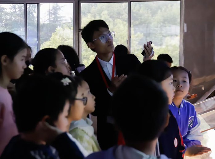 上午10时,小朋友们在地质博物馆讲解员的带领下,直观感受地球深厚历史底蕴、体悟学科发展脉络。从地质变迁历史到郯庐断裂带发现历程,从学校教师科研育人故事到地质学家奋勇争先的拼搏精神,大家在展厅中逐步探寻科学前辈追求真理的决心和矢志不渝的报国情怀。