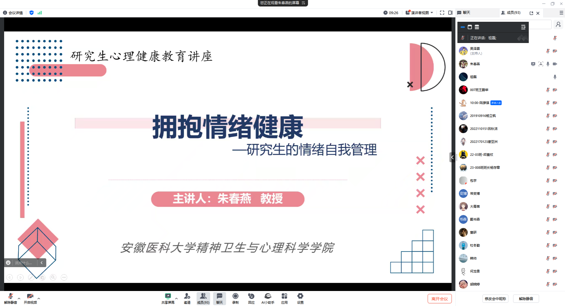 此次报告会为研究生提供了情绪管理的实用知识,确保研究生在追求知识的道路上,保持积极乐观,拥抱健康情绪,以更好的状态迎接未来的挑战,实现学术与身心的双重成长,为科研创新注入源源不断的活力。