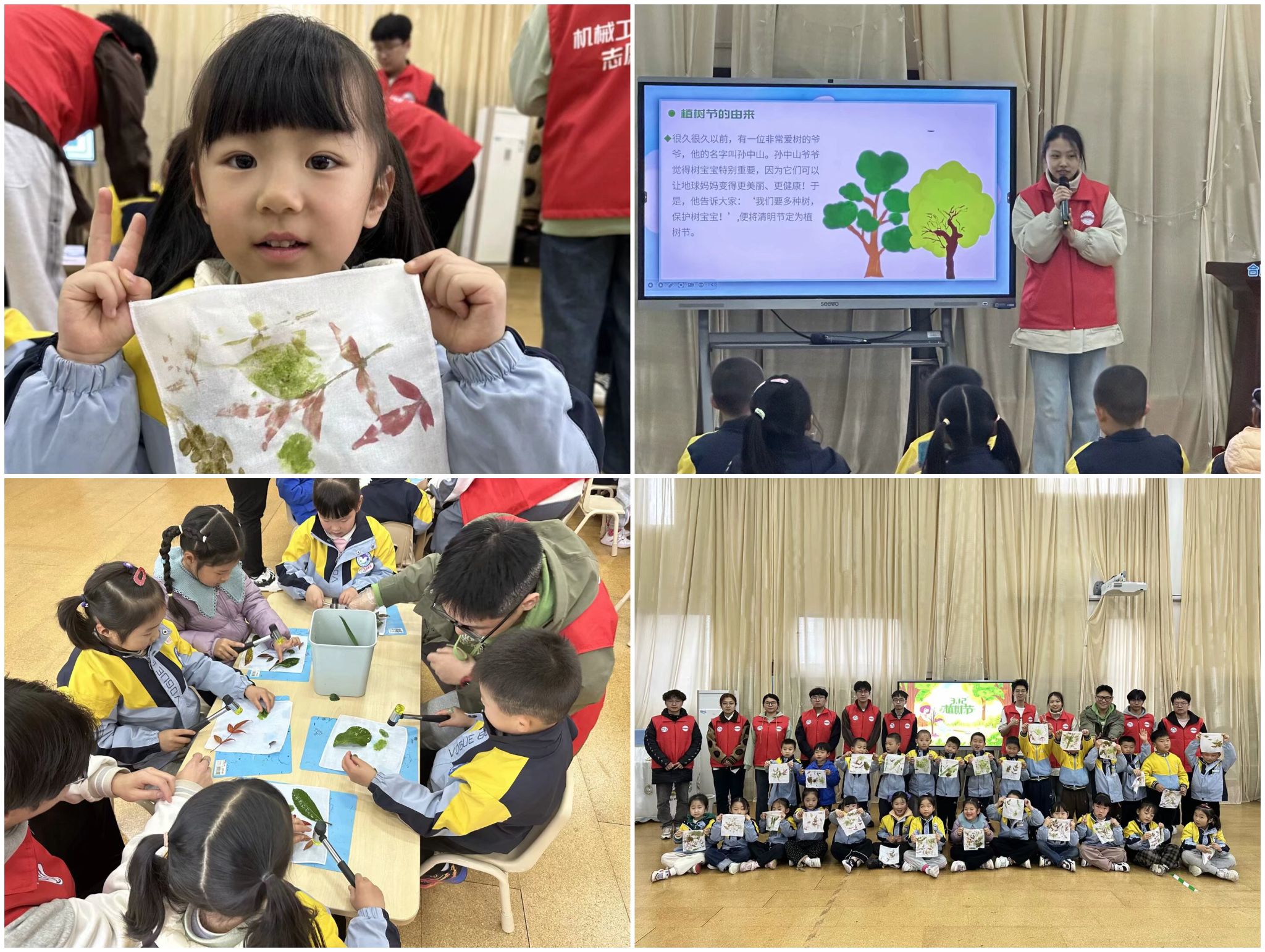 活动开始前,志愿者们在孩子们午休时提前把活动要用的材料筹备完全。志愿者首先引领孩子们进入活动现场落座。课堂环节中,志愿者通过图文视频资料,向孩子们生动讲解植树节的由来、树木对生态环境的重要作用,并科普日常环保小知识。为加深理解,活动特别设置树叶拓印画手工实践环节。在志愿者的协助下,孩子们用树叶、棉布和橡胶锤创作出独具特色的自然拓印作品,亲身体验植物形态之美。