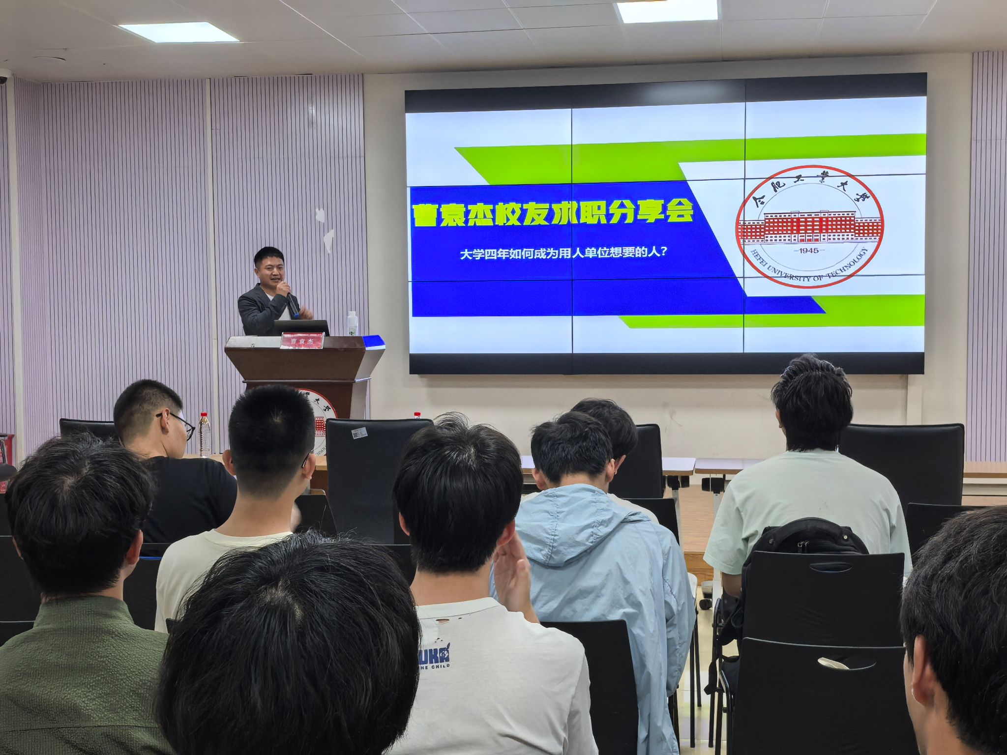 报告接近尾声,曹袁杰以“初心永怀,工业报国”寄语在场学子,一句“我们永远是工大人”饱含深情,传递出校友对母校的深厚情感与责任担当。他希望同学们珍惜宝贵的大学时光,尽早做好职业规划,努力成长为用人单位需要的优秀人才。