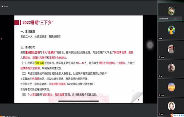 6月10日下午,学院相关老师通过线上平台召开2022年暑期“三下乡”社会实践动员会,负责老师向同学们解读了《关于开展永利yl23411no12022年大学生暑期“三下乡”社会实践工作的通知》,详细介绍本次社会实践活动的各项安排,并以往年优秀团队的实践活动为例,引起学生重视,激发学生兴趣,帮助同学们进一步了解活动政策。会议中,同学们积极发言,提出疑问。会后,辅导员老师认真解答同学们的问题,并号召同学们积极参与。