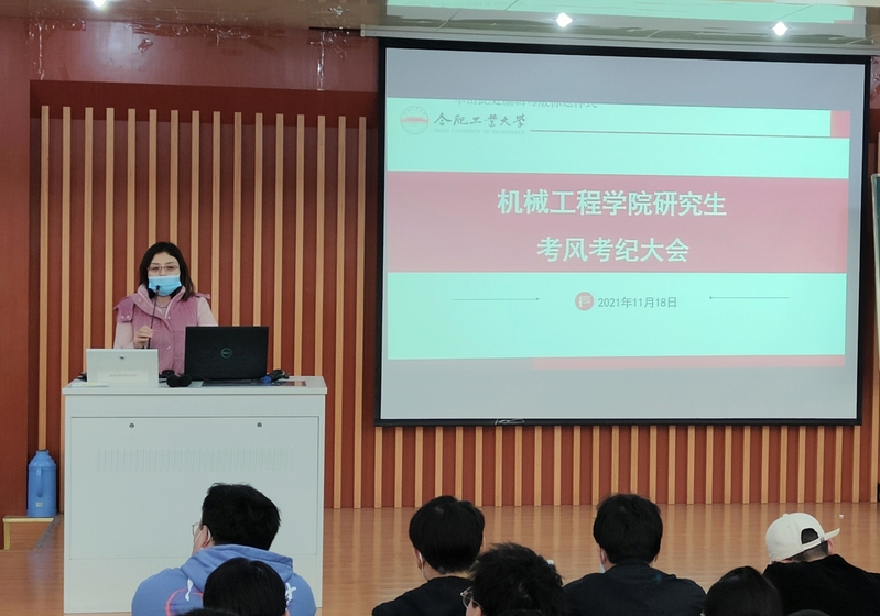 为了进一步严肃考风考纪,构建诚信校园,11月18日下午14:30,我院在机械楼214报告厅召开2021级新生“研究生考风考纪”大会。本次大会由研究生辅导员侯静和兼职研究生辅导员张地主讲,2021级全体研究生到场参加了此次会议。