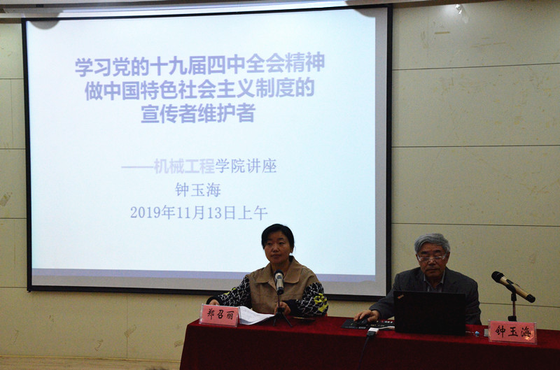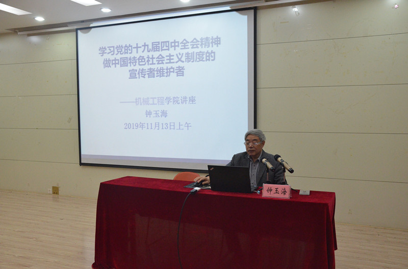 10月28日至31日,中国共产党第十九届中央委员会第四次全体会议在京召开,为深入学习贯彻党的十九届四中全会精神,11月13日,永利yl23411no1在屯溪路校区格物楼多功能厅开展中国共产党十九届四中全会精神专题学习活动,校关工委钟玉海教授应邀作了《学习党的十九届四中全会精神,中国特色社会主义制度的宣传者维护者》专题辅导报告,该院党委相关负责同志、政工干部、教师党员代表、学生党员代表共70余人参与了此次活动。