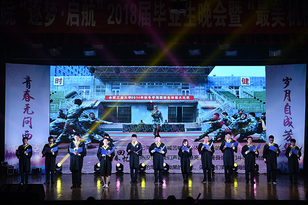 情系机械、不说再见,2014级辅导员带着毕业班女生再现了广播操比赛的创意舞蹈《小苹果》,《那年,今日》舞动的不只是美好的回忆,更是他们的青春年华。由机设3班万岳峰同学对《Planet》重新填词制作,送给同学们的毕业主题曲《遇见》伴着拍摄的MV,蕴含着不舍的情谊、岁月的回忆。《曾经的日子》是学生们自导自演的音乐剧,赞美了友情、爱情还有工大情,展现了机械学子的浪漫情怀。四年前,同学们用稚嫩的双手写下“给四年后自己的一封信”,放进定制的“青苹果”之中,四年过去了,青苹果变成了熟透的红苹果,满载着丰收的喜悦,也填满了诚意满满的回信,在回信的字里行间编著一部感人至深的《青春纪念册》。由全体班长领衔的青春诗朗诵《再见了,我的合工大》深情地展现了毕业生心系母校的浓浓情谊,一声“工大,我不想走”戳中无数泪点。最后,由辅导员田崇浩、甘婧领唱的《启程》音乐响起,同学们再也按捺不住内心的激动之情,全场起立,带着喜悦与不舍互诉别离,观礼嘉宾、老师无不动容,全场近八百余人共唱《启程》,歌声响彻斛兵礼堂、响彻师生心房,浓浓的爱校情结深深打动了每一位在场的师生,激动的心情久久不能平静······