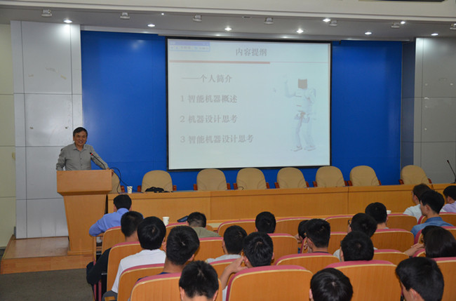 报告开始之前,訾院长先向大家介绍了王德伦教授的成就。接下来,王教授从“机构分析与综合”“精度设计与检测”和“结构与性能设计”三方面出发,结合他本人的多个自然基金项目和机床重大专项课题,向大家简要介绍了他一直以来在机构的运动几何学方面的研究工作。之后,王德伦教授以美国波士顿动力公司的招牌智能机器人“大狗”为例,重点探讨了他对于人工智能在机械设计特别是机器人领域的深入应用方面的思考。他指出,机械设计已经从数字化设计时代进入智能化设计时代,如何从内涵和组成等多个角度去理解智能机械设计的意义显得尤为重要。最后王德伦教授对智能机器人未来的发展进行了展望,他认为,智能机器人的应该具有自主生存能力,因此如何利用人工智能技术来自主获取能量或可成为机器人领域未来的一个重要研究方向。
