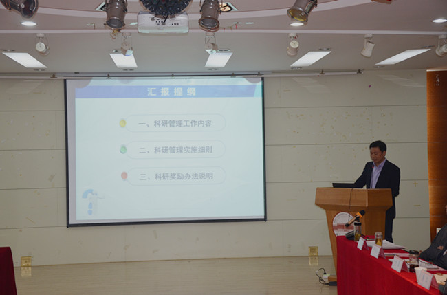 校科研院院长郑磊教授在致辞中,首先祝贺学院科研会议的召开,介绍了近年来学校的总体科研情况,并从国家重大项目、高水平成果、人才团队以及科研基地建设等方面介绍了科研院近期的工作重点。他指出学校将大力培养青年拔尖人才和协同创新团队,重点支持重要科研基地的申报和建设,希望广大教师积极参加重点研发计划、国防重大项目的申报。