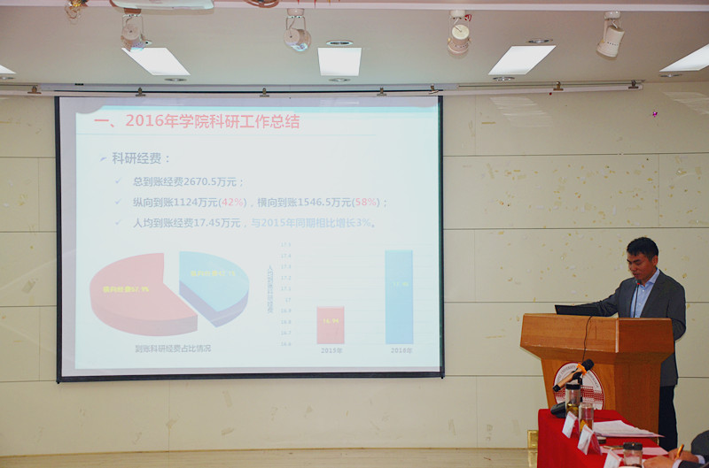 学院副院长黄海鸿教授代表学院做了学院科研工作报告。他重点回顾了2016年度学院科研整体情况,报告了2017年度学院科研工作计划及目前的完成情况,同时强调了近期学院的科研工作重点,并希望学院教师要转变科研思路、提升科研质量、共同推进学院科研事业发展。随后,院长助理王道明和叶家鑫分别就学院科研管理与科研奖励政策、研究生培养工作政策分别进行了汇报和解读。