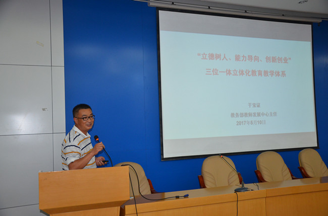 教务部教师发展中心于宝证主任系统地解读了学校“立德树人、能力导向、创新创业”三位一体化教育教学体系。他从“为什么要构建?”“如何构建?”“关键环节”三个层次进行了说明。于主任分析了目前教育教学活动中普遍存在的两个角色弱化和五个方面脱节的问题,指出了构建三位一体教学体系的重要性和迫切性。从“立德树人、能力导向、创新创业”以及师资队伍建设培养等方面阐述了构建教学体系的方式方法。同时,他还强调,构建三位一体化教学体系要重点把握教学评价、教师能力提升和课堂教学效果等关键环节。