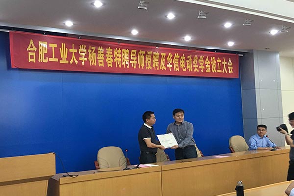 5月18日下午,为进一步培养大学生创新创业能力,实践卓越工程师培养计划,永利yl23411no1举行安徽华信电动科技股份有限公司董事长杨善春特聘导师授聘仪式及创新创业报告会。訾斌院长和黄海鸿副院长出席了授聘仪式,会议由黄院长主持。