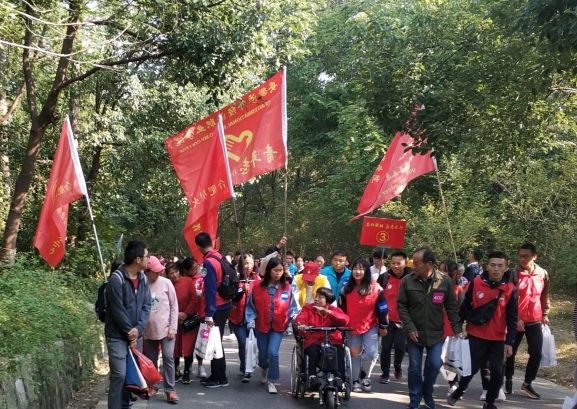 上午8时左右,合理分组后,登山正式开始。一路上,志愿者们不时伸出援手,尤其在陡坡路段,大家齐心协力,通过前后推拉轮椅帮助老人继续前行。桂花飘香的山路上,阳光明媚,透过树影而下,落在大家肩上身上,洒在脸上笑容里。不是春光胜似春光,老人们心情大好,不是逗留在山路上拍照留影。狭窄的山道上志愿者们及时维持上下通行秩序,提醒大家登山莫看景,看景莫登山,防止意外发生。经过近一个半小时的努力,大家平安顺利到达山顶。
