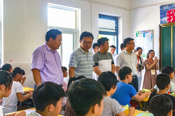 7月19日下午,安徽省红十字协会党组成员、秘书长曹芦松,宿州市红十字会专职副会长卓海波,合工大扶贫办副主任、灵璧县副县长李宏国一行来到灵璧县虞姬乡陈埝小学看望我院紫笛社“益行计划”志愿服务队志愿者。